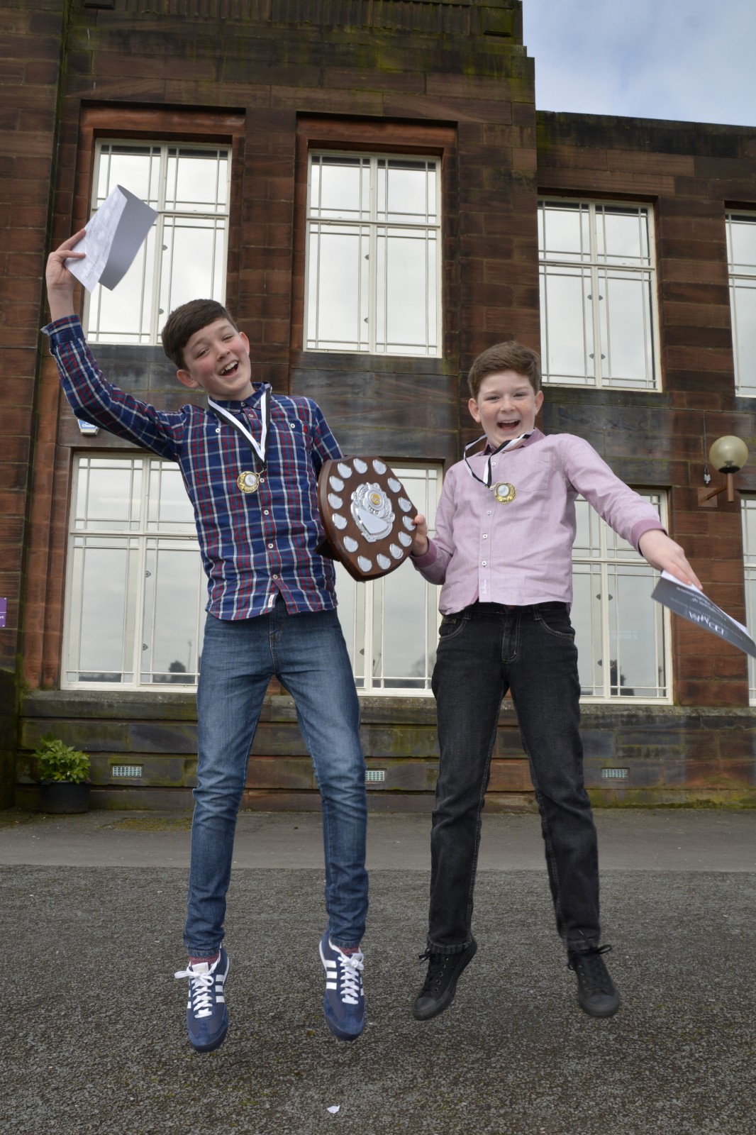 Finlay and Fergus Bainbridge jump for joy after winning the duet class